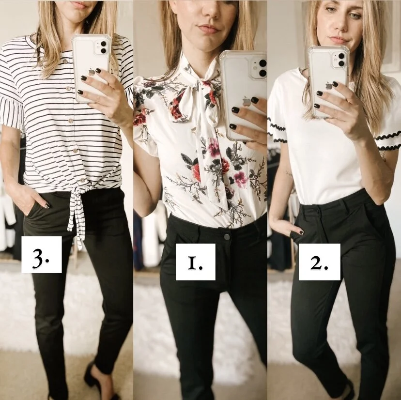 Workwear Tops & Bottom Tops Jul 9 Written By Ashley Marshall Links below Top #1 (Floral) Linked HereTop #2 (White) Linked HereTop #3 (Striped) Linked HereDress Pants Linked Here Ashley Marshall
